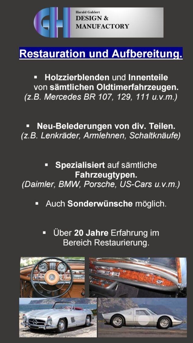Die Restaurationen überstrecken sich auf die gesamten Holzzierteile, welche in Serie verbaut sind, aber auch zusätzliche Teile im Interieur sind machbar. Fragen Sie einfach über den E-Mail Kontakt, Telefon, Whatsapp an. Unser Service Team berät Sie sehr Umfangreich was umsetzbar ist.